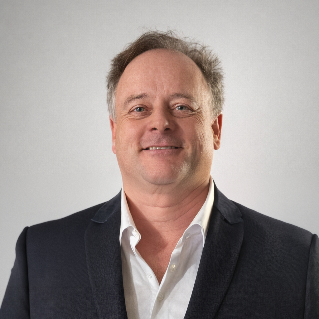 A professional portrait of a man in a dark suit and white shirt, looking at the camera against a gray background.